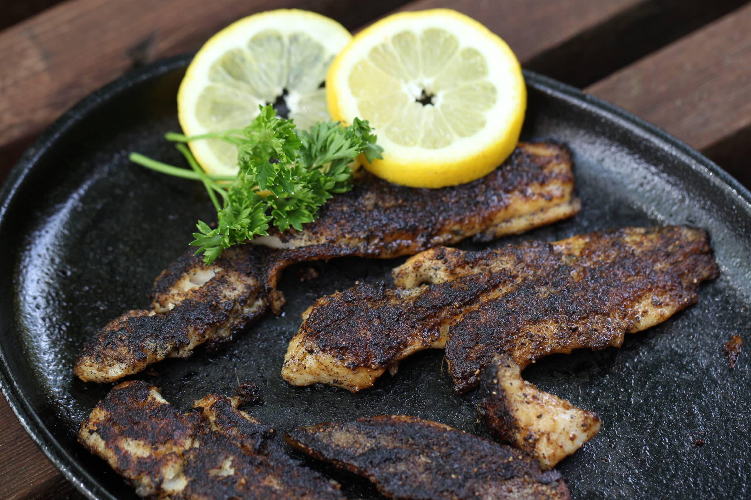 To prepare the fish, heat cast iron or heavy bottomed skillet over medium/high heat. While skillet is heating, season the filets. Sear the fish until blackened and the internal temperature reaches 150°F.