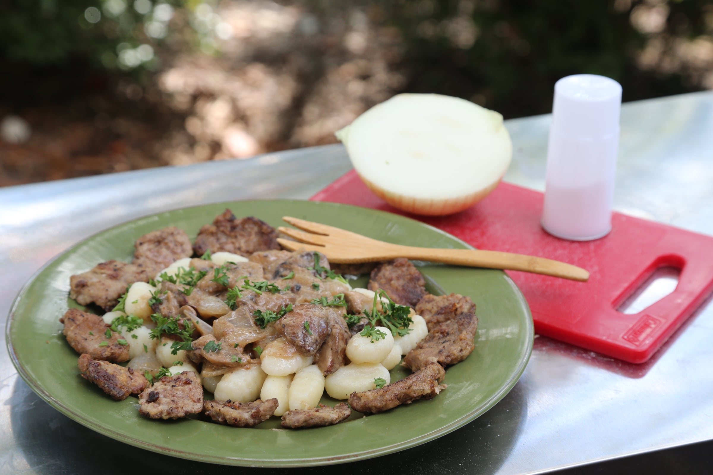 3-4 chicken, dove, quail OR squirrel breasts (boiled, skin removed, deboned and pulled apart; prepare ahead of time and bring to camp)