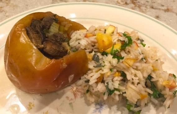 Start a full chimney of charcoal. Then, core and cut off the top of all the apples (discard cores, save tops). Slice and dice the apple tops (Reserve half for meat mixture and ½ for the Walnut herb rice recipe). Gently scoop out the inside of the apples; carving out a bowl with ½ inch thick walls (A melon baller works well for this). Chop half of the scooped apple pulp and place in a bowl, discarding the rest. Place oil in the Dutch oven and set oven on a medium bed of coals, lid off. Add and sauté the celery, onion, sage, parsley, chopped apple pulp, lemon juice, sugar, and salt & pepper to taste (about 5 minutes). Remove the Dutch oven from the heat and place it on an oven stand. Spoon out sautéed mixture and place in a mixing bowl. Add the roasted and chopped duck meat; stir to combine. Set aside. Place each apple bowl on a piece of aluminum foil (about 10-12” long). Stuff each apple bowl with meat mixture until level. Wrap each stuffed apple in the foil. Place apples in the Dutch Oven with lid on. When charcoal is ready, bake at 400 degrees using 29 coals: 10 coals on bottom and 19 coals on top.