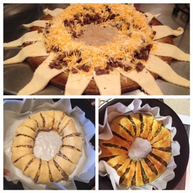 Prepare one charcoal chimney of coals. In a bowl, mix meat and pizza sauce until combined. Add parchment paper to the oven. Open the crescent roll, unroll and separate each triangle. On the parchment-lined oven, arrange the triangles so the thicker ends are overlapping each other and the thin points are extending away from the center of the circle as you form a ring (use both cans). Spoon a generous portion of cooked meat mixture toward the center of the ring, on the larger ends (not towards the points) of the dough. Next, layer the pepperoni and canadian bacon on top of the meat mixture. Then, layer on the cheese and sprinkle seasoning on top of the cheese. Next, pick up each triangle point and place it up and over the filling mixture. For a 14” Dutch oven, use 30 coals: 20 charcoal on top and 10 charcoal on bottom for 30-35 minutes or until crescents have turned brown. Plate and serve with ranch dressing or pizza sauce.