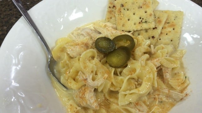 Prepare one charcoal chimney with coals and place the Dutch oven on the medium bed of coals. Add broth to the oven, followed by spices to taste (sprinkle across oven); put lid on and bring broth to boil. Add egg noodles and cook 8 minutes with lid on. When noodles are done, stir in prepared chicken and cubed cheese. Remove oven from heat and keep covered with lid; wait 5 minutes before removing lid and stirring. Serve with spicy fire-crackers (recipe below) or cornbread and salad. Add sliced jalapeños to garnish.