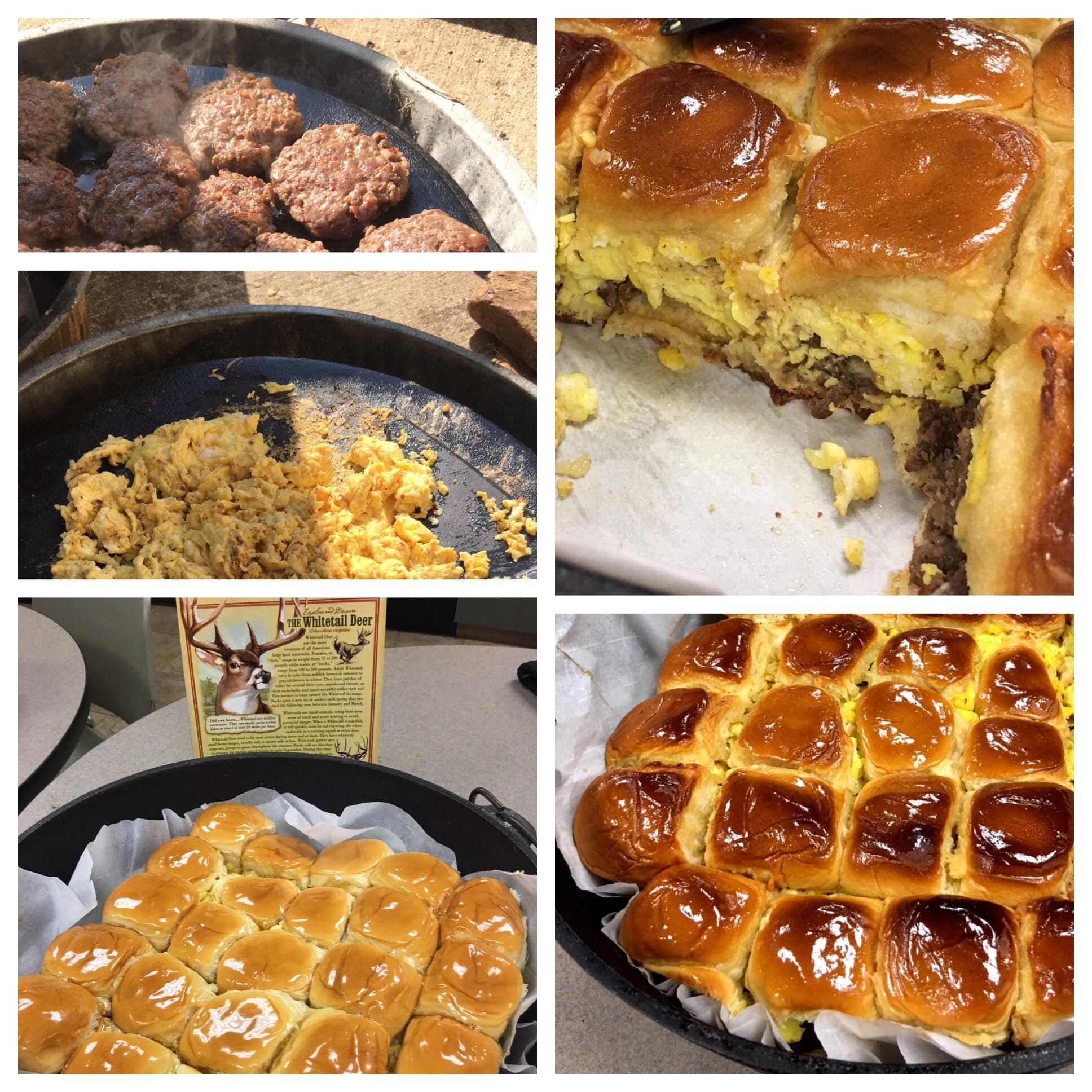 Slice through the Hawaiian rolls horizontally and place the bottoms of the rolls in the dutch oven. May have to remove one row and fit in the side of the oven. Layer the cooked sausage patties, scrambled eggs and cheese slices on top and then place the tops of the rolls on top. Use a knife to follow the lines of the rolls and slice through the layers to form individual sandwiches. Melt the butter in a cast iron sauce pot or a pot over the coals. Stir in the syrup until it is completely combined and appears creamy. Brush the syrup mixture over the top of the sandwiches allowing it to lightly drip between the cracks. Don’t use all the mixture – too much can cause the sandwiches to be mushy. Just brush the tops and allow some to go down the sides of each roll. Bake at 350F for 10-15 minutes or until heated through and the cheese is melted.