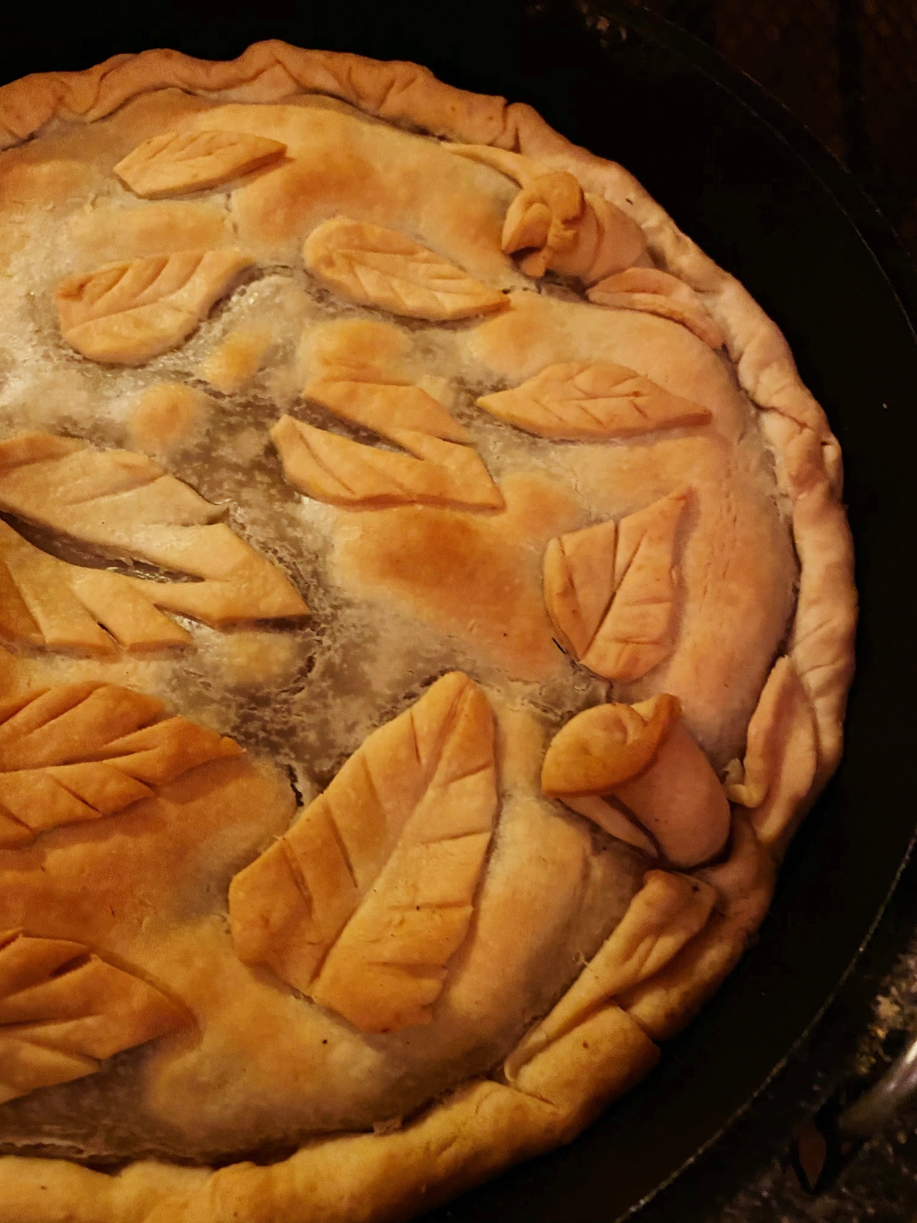 Prepare 1 charcoal chimney of coals. Spray Dutch Oven with cooking spray (lightly to coat). Mix pre-cooked meat, mushrooms, and gravy together in a bowl. Roll out the first dough roll and insert into the Dutch oven. Shape the dough up the sides of the Dutch oven using your clean fingers. Use half the second roll to add to the crust in the Dutch oven for a higher crust up the oven walls. Using a fork pierce the bottom of the crust, in various spots, for venting. Place the meat and gravy mix on top of the crust and spread to even out. Roll out another dough roll and place it on top of the meat mixture. Seal its edges with the lower crust wall. Use the extra pie crust to cut out fall shapes with cookie cutters. Add the shapes onto the top pie crust in a decorative manner. Take a knife a make a few thin slices into the top crust for venting. Brush the top crust with melted butter, and then place the lid on and bake at 350 degrees for 45 minutes.