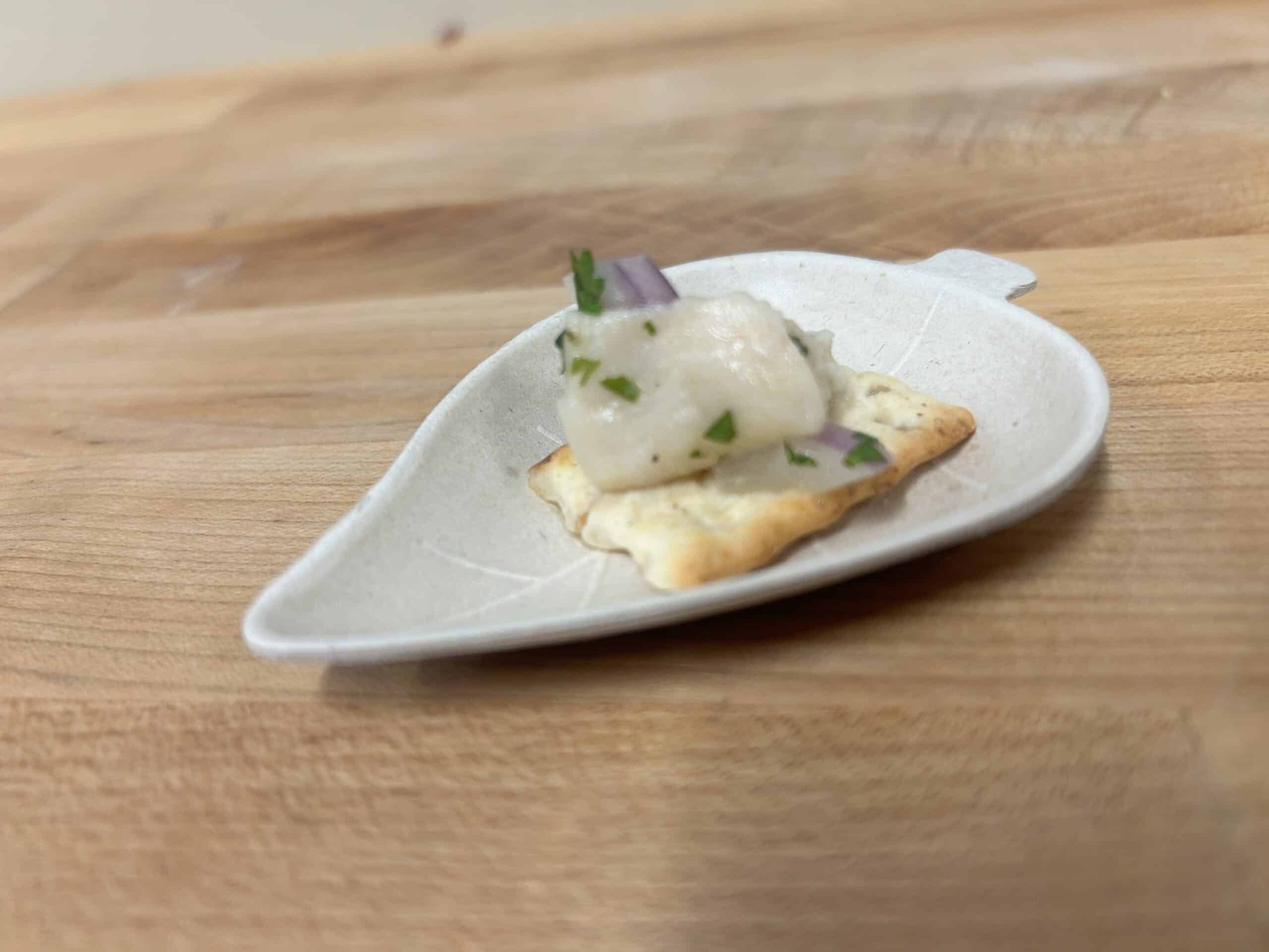 Before serving, lightly dust with crushed wasabi peas, a slice of pickled ginger, and some flaky salt.