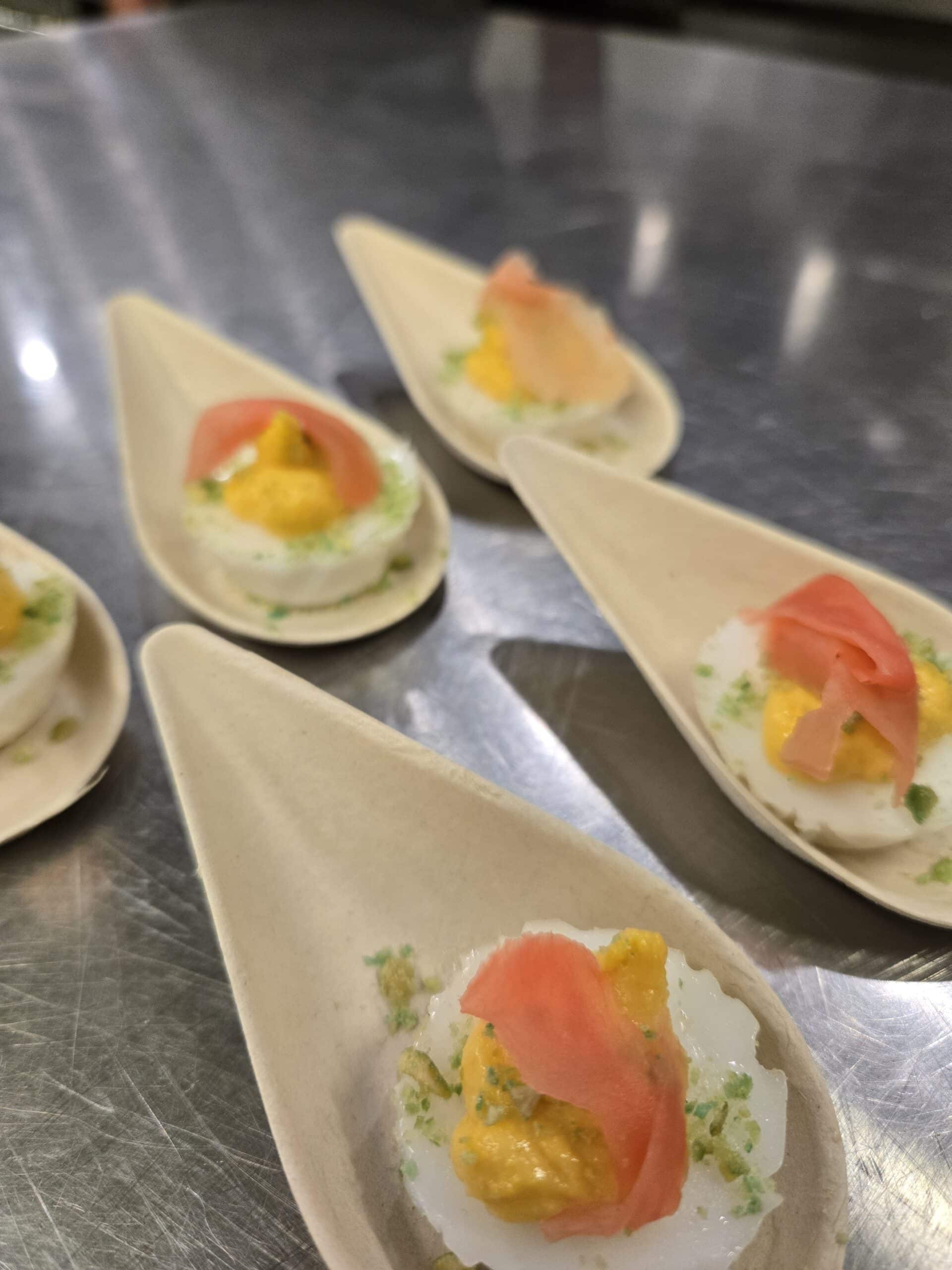Transfer yolk mixture to a piping bag fitted with a wide tip or other preferred tip. Pipe mixture evenly onto each egg white. Place in the refrigerator to cool down.