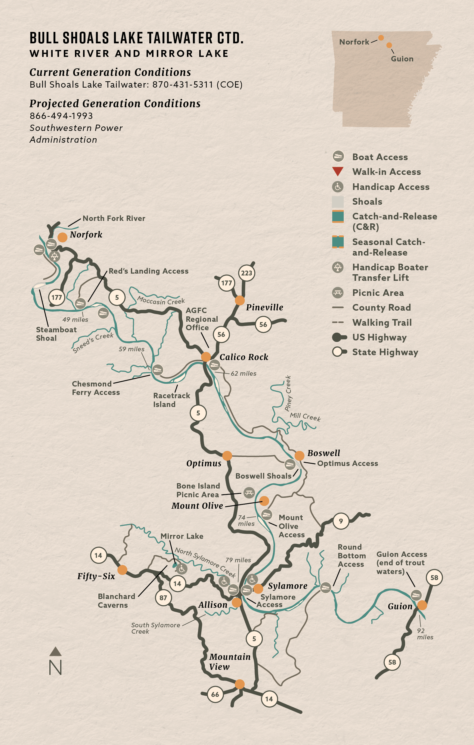 Bull Shoals Dam was constructed on the White River in 1952 for flood control and hydroelectric power generation. As with other dams in the southeastern United States, operations from this project created coldwater habitat unsuitable for native fish species. Experimental stockings of rainbow trout and brown trout demonstrated exceptional survival and growth. Regular stockings of these two species began in 1955. The AGFC manages trout fisheries in the White River from Bull Shoals Dam to the Arkansas Highway 58 Bridge at Guion.