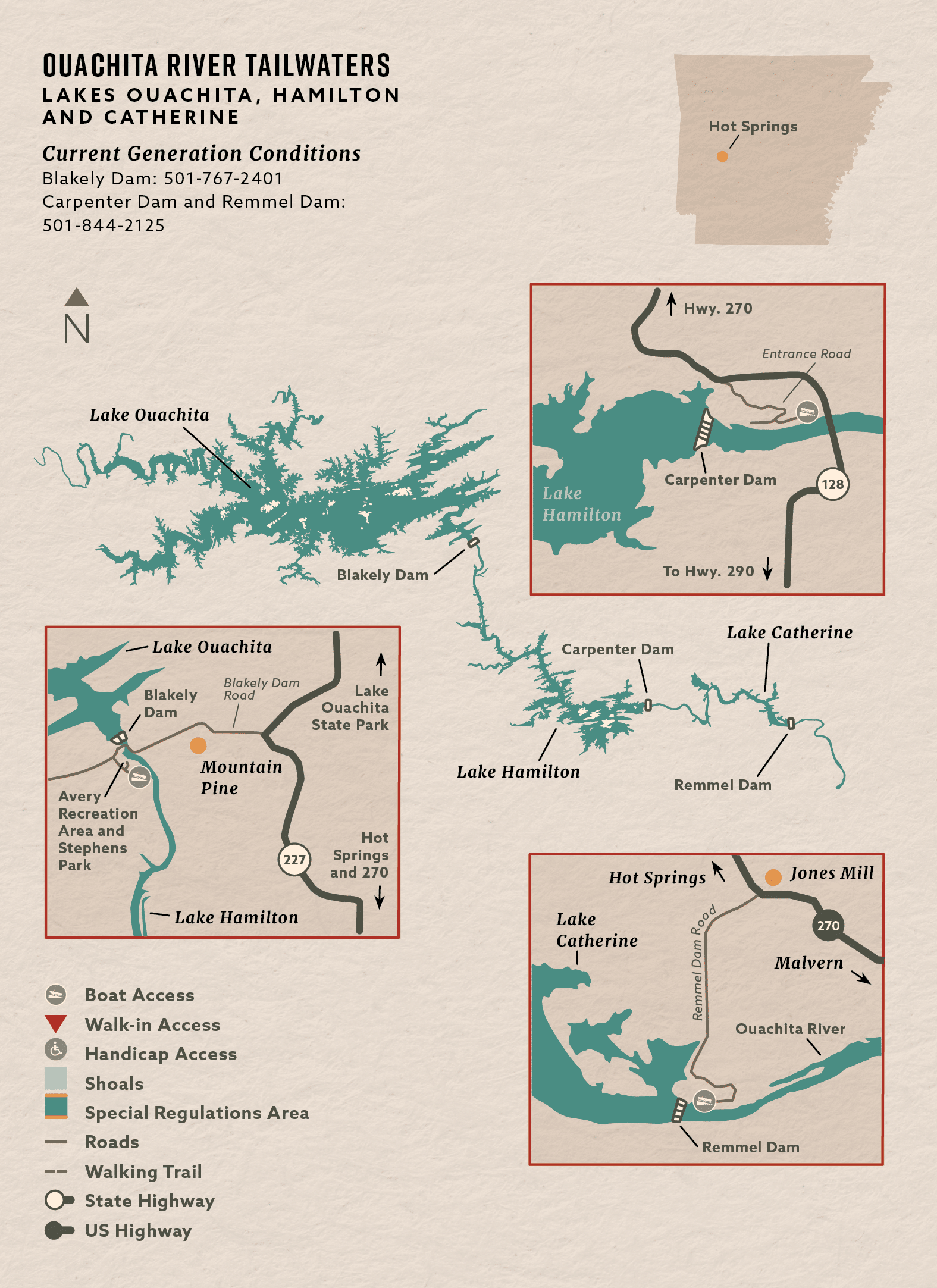 The tailwaters below Blakely, Carpenter and Remmel damns on the Ouachita River are stocked seasonally to provide anglers in the southern part of the state with the opportunity to fish for trout. Catchable rainbow trout are stocked from November through April to take advantage of cooler water temperatures.