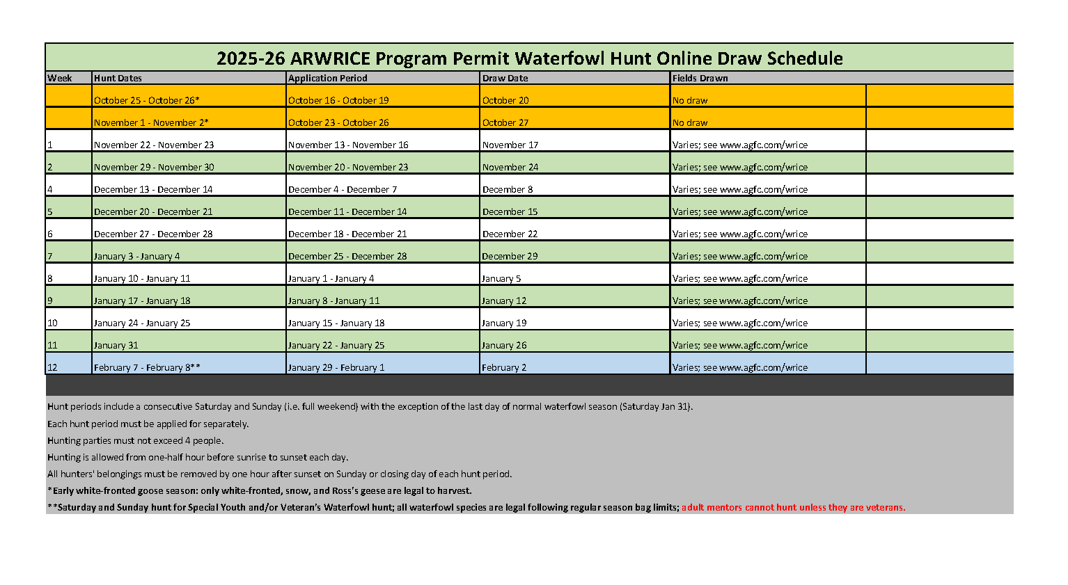 The Arkansas Waterfowl Rice Incentive Conservation Enhancement (WRICE) program was developed by AGFC biologists to help keep waste rice available for ducks, geese and other migrating birds when they pass through each winter. It has recently been expanded to allow weekend permitted public waterfowl hunting opportunities on participating rice fields. Farmers may still operate and harvest their rice fields as normal, but can receive added income by leaving stubble and flooding fields during waterfowl migration, and allowing permitted public hunting opportunities.