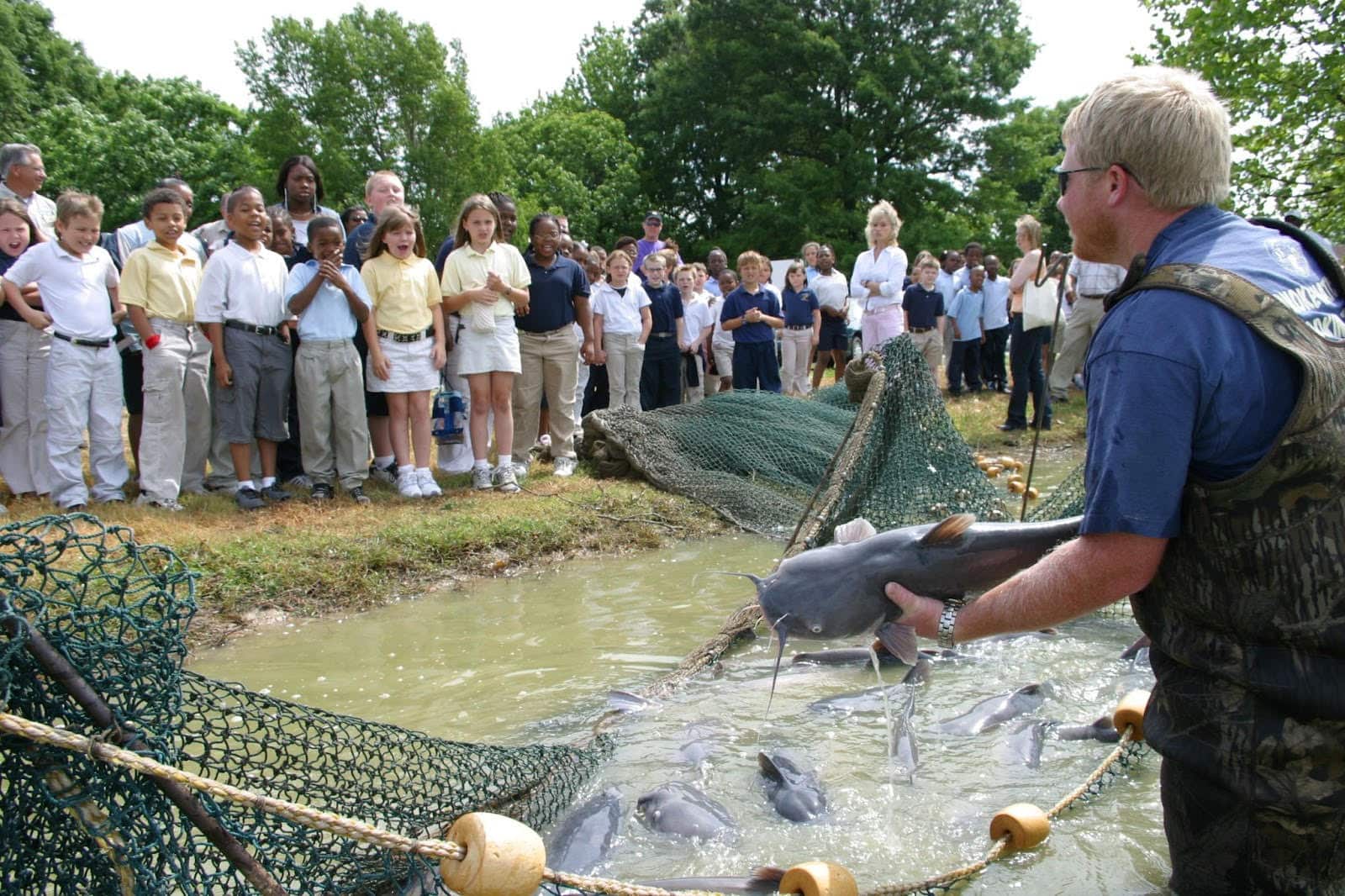 AGFC Assistant Chief of Fisheries Jason Miller shows a school group how catfish are harvested from ponds to be stocked around the state. AGFC photo.