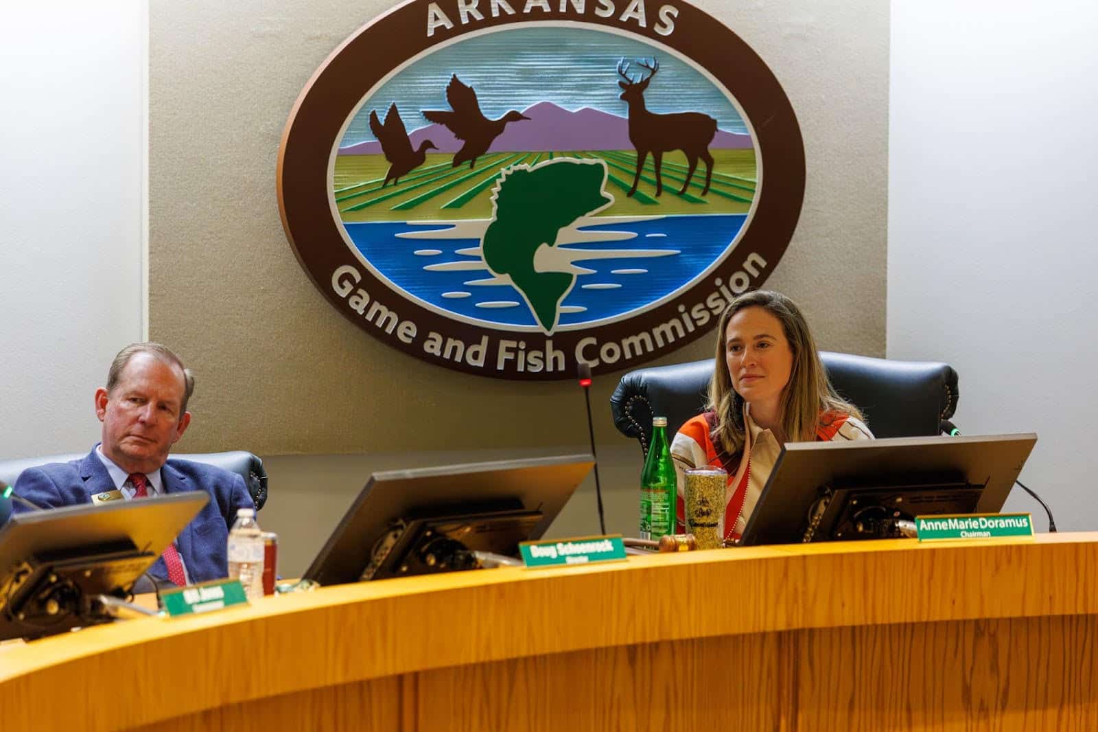 AGFC Director Doug Schoenrock and AGFC Chairwoman Anne Marie Doramus listen to proposals that included more than 65 regulations being eliminated for 2026. AGFC photo.