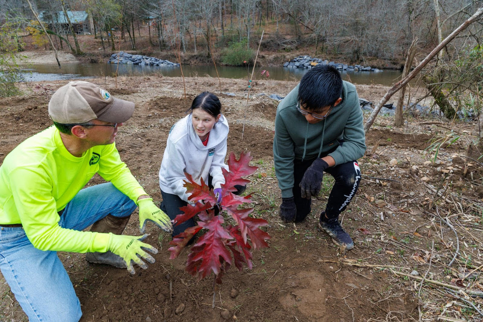 Interns take direction from an AGFC Stream Habitat Program biologist in planting trees to stabilize the banks of a stream. AGFC photo by Mike Wintroath.
