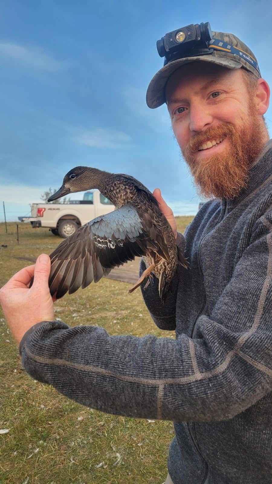 AGFC biologist Cayce Guy takes a minute with a male mallard that’s not yet in its breeding plumage to take a photo in the Prairie Pothole Region. Photo courtesy Cayce Guy.
