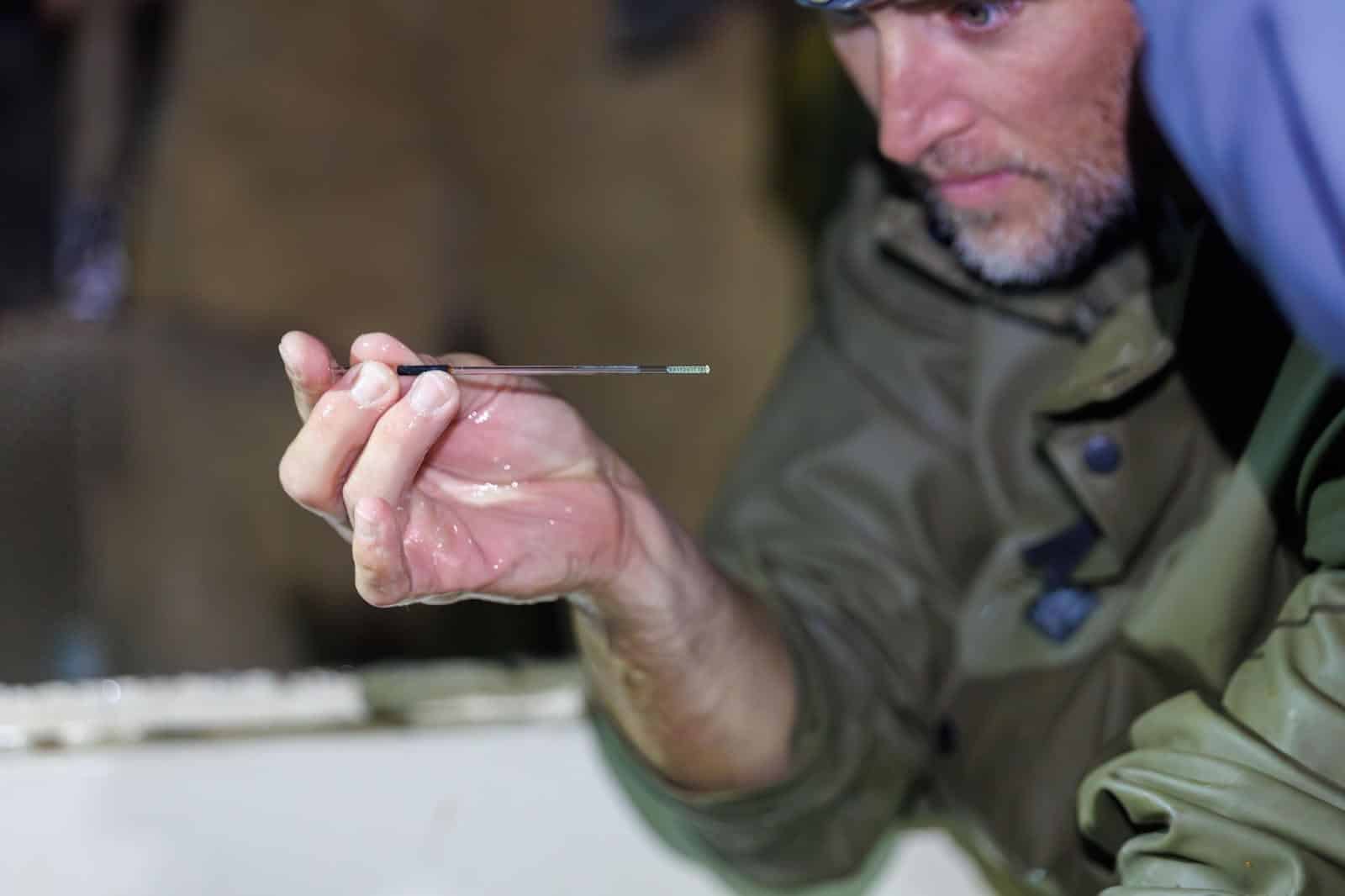 Newman’s team also takes fin clips of the males and females caught for genetic study.
