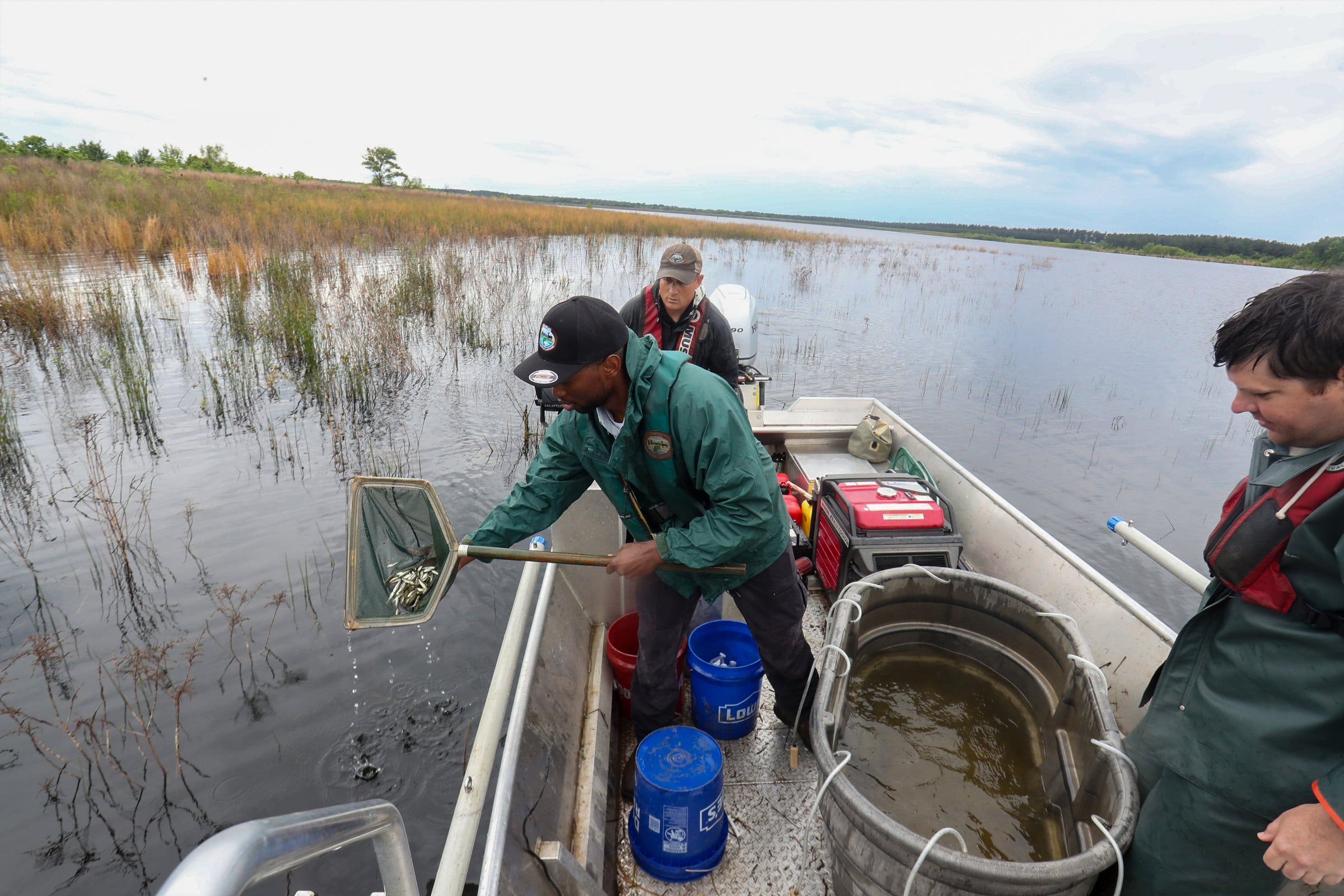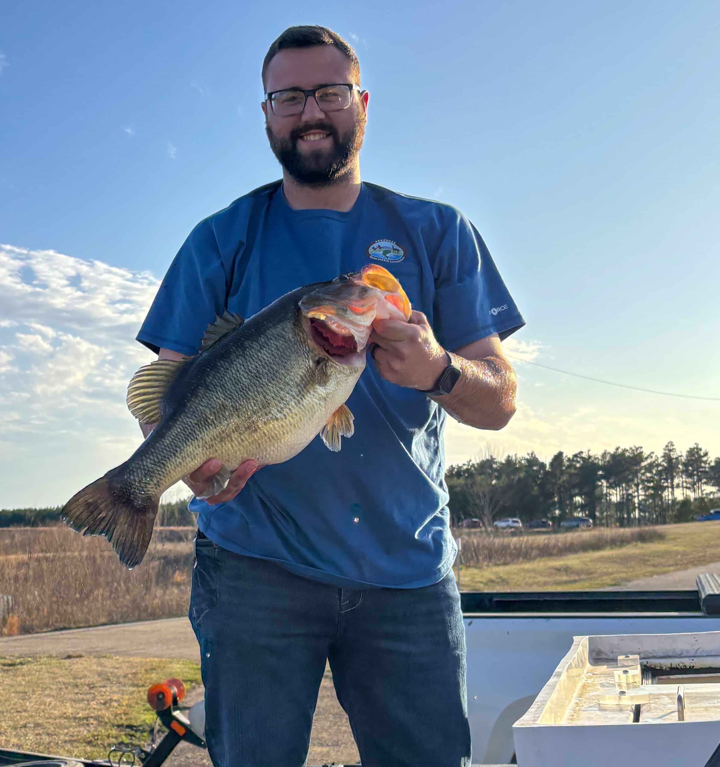 AGFC Fisheries Supervisor Ryan Mozisek assisted with fish care until the Legacy Lunker transport vehicle could arrive to take possession of Martinez’s 10.22-lb. Bass. AGFC photo.