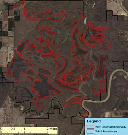 Booth said conditions immediately preceding the die-off in Henry Gray Hurricane Lake WMA were beginning to be seen in portions of Bayou Meto’s greentree reservoirs near DeWitt as well. This has prompted water management changes at this famous duck-hunting area as well. For the 2021-22 wintering period, area managers will only hold water artificially at 179 MSL, a foot lower than historically flooded levels. During the 2022-23 season, managers will reduce the managed water level another half foot, keeping the maximum artificial flood level at 178.5 MSL during winter.