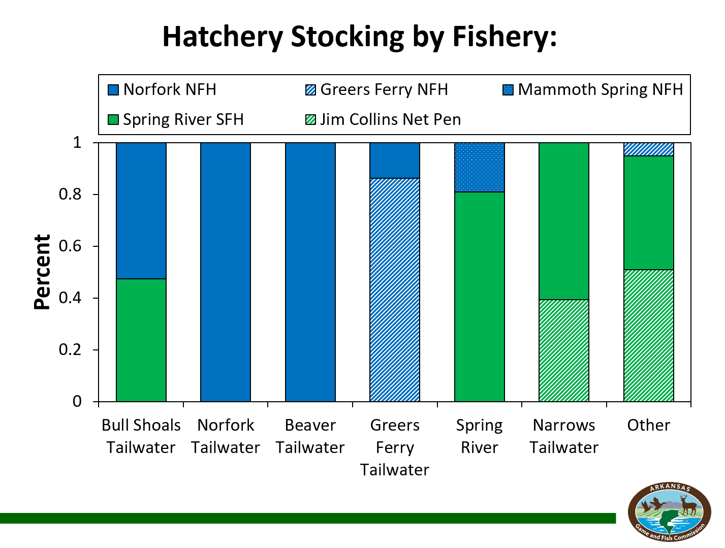 Trout from the Norfork National Fish Hatchery typically supply more than 50 percent of the rainbow trout in the White River, and all of the rainbow trout stocked in the Beaver and Norfork tailwaters.