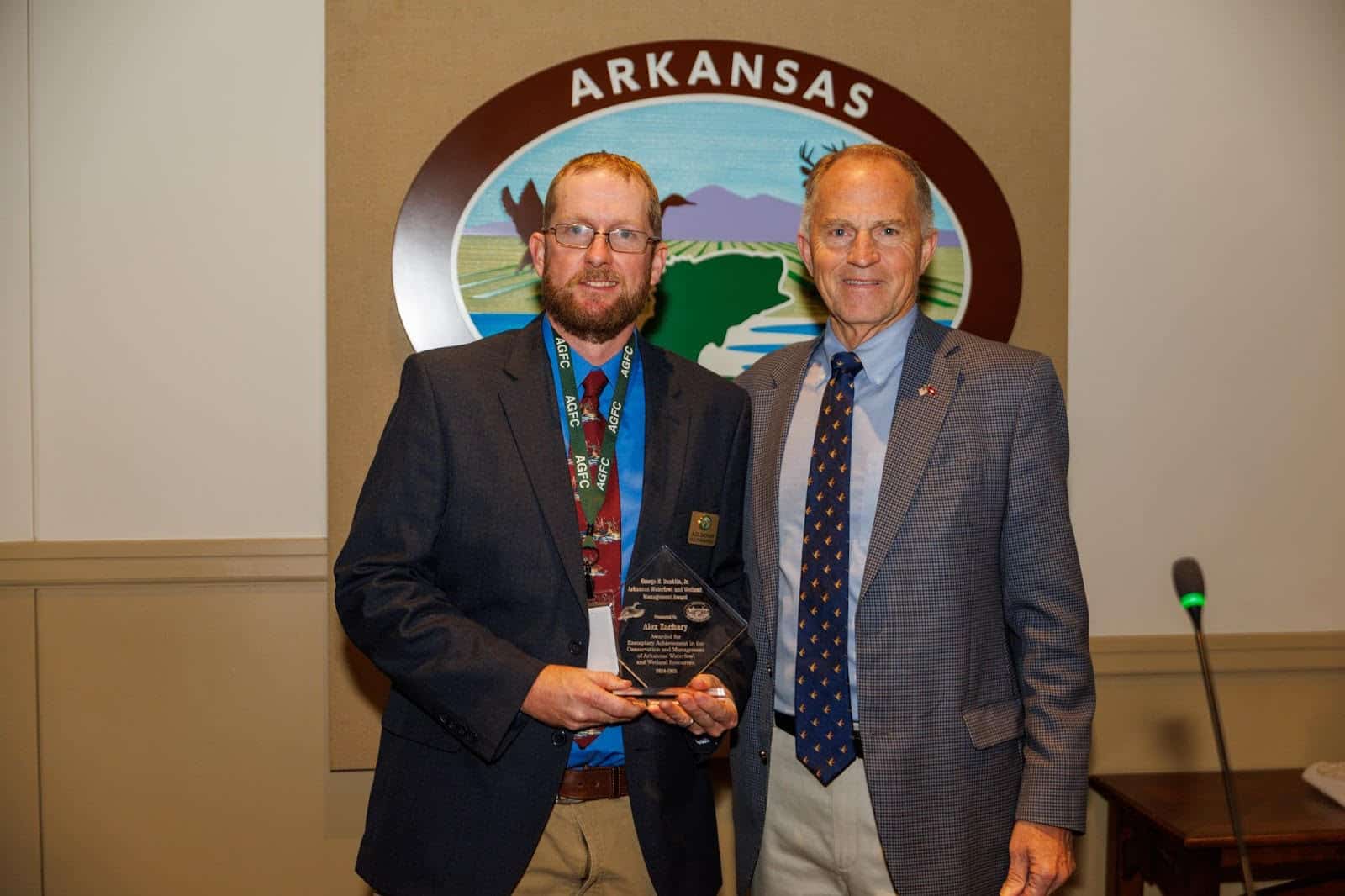 Alex Zachary, AGFC biologist who oversees Ed Gordon Point Remove Wildlife Management Area near Plummerville, received the 2025 George Dunklin Award for excellence in wetland and waterfowl management. Zachary has modernized the waterway and wetland habitat at Ed Gordon Point Remove. He has led on-the-ground efforts to update infrastructure improvements, and is vital in not only management of the area but also reviewing regulations to ensure they are as concise and effective as possible.
