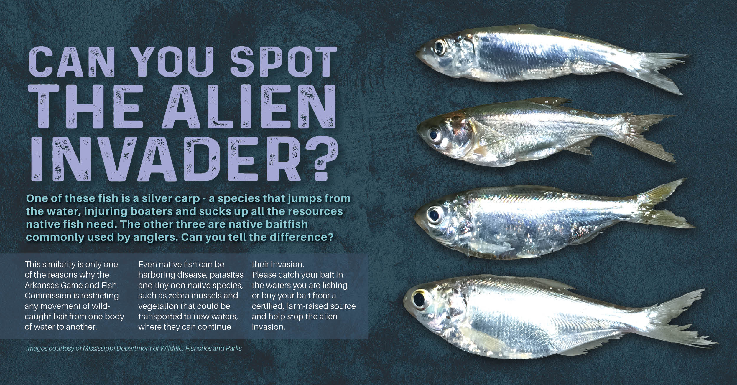 Live bait is the best way to ensure a bite when you take a fishing trip, but those minnows you’re using may not be minnows after all. The water they are in also could harbor pathogens or bits of harmful aquatic plants that aren’t native to the lake or stream where you are fishing. Because of this, AGFC prohibits movement of live-caught bait, including crayfish, between bodies of water. Any live bait used must either be purchased from a certified bait provider or come from the body of water where you are fishing. Young invasive carp, such as silver and bighead carp, for instance can look very similar to shad, a native baitfish preferred by anglers targeting striped bass. Also dump unused baitfish on the shore or in the trash where they cannot find their way back into the water. It may seem like a waste, but accidentally introducing invasive species to the water is much more devastating.