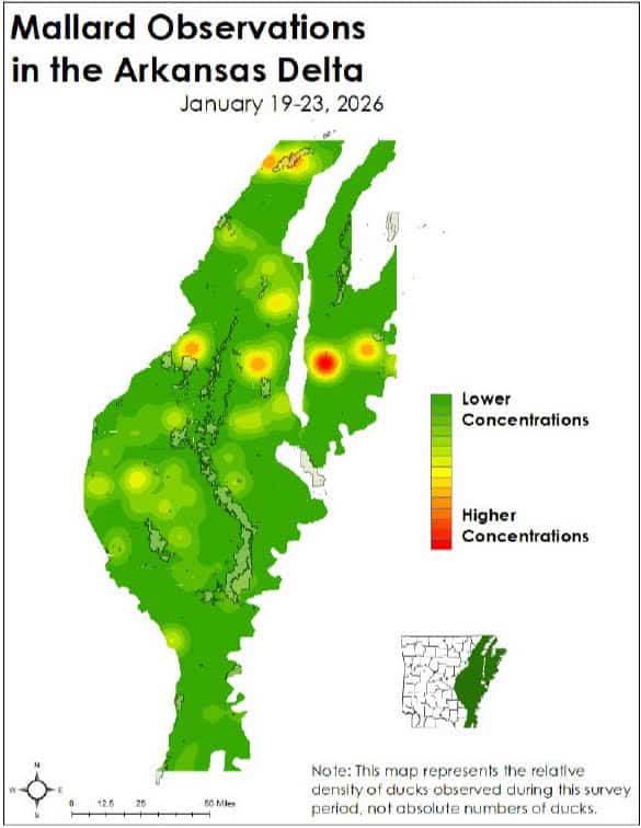 Mallards were in four distinct areas of Arkansas during the late-January aerial survey, according to AGFC waterfowl biologists.