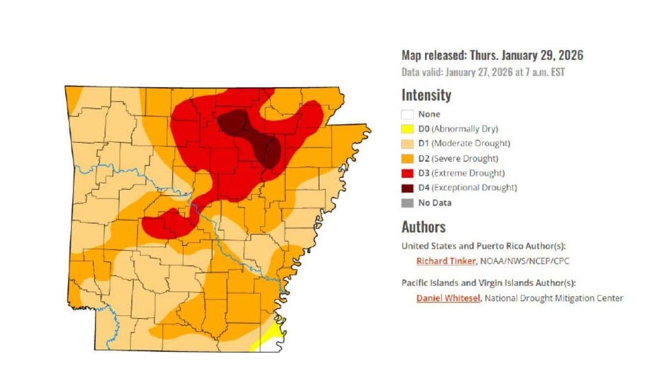 Brett Leach, the AGFC’s waterfowl program coordinator, said, “This duck season was characterized by dry conditions, ranking from the third driest on record in northeast Arkansas to the 22nd driest in the southeast portion of the state. January continued to see dry conditions and was classified as in even further drought, with 99 percent of the state in moderate to exceptional drought.”