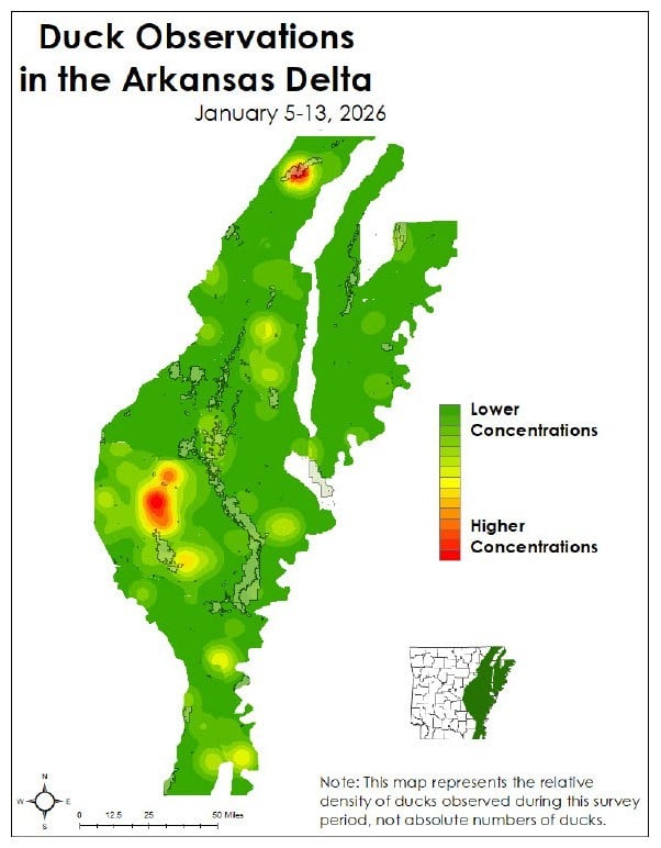 This was followed by the Lower White River, Black River-Upper White River and Cache River survey zones, which had an estimated 33,000-38,000 mallards. Hot spot maps indicate several key duck concentration areas primarily in the central and far northern portions of the Delta.