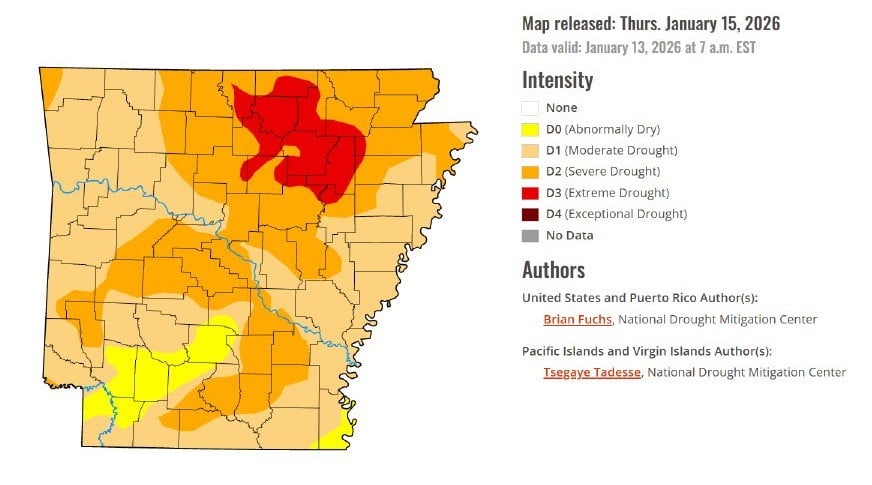 (3) Drought conditions have gotten worse over Arkansas in the first half of January, according to the national drought map, with a larger area of extreme (red) and severe (darker brown) conditions as of Jan. 15.