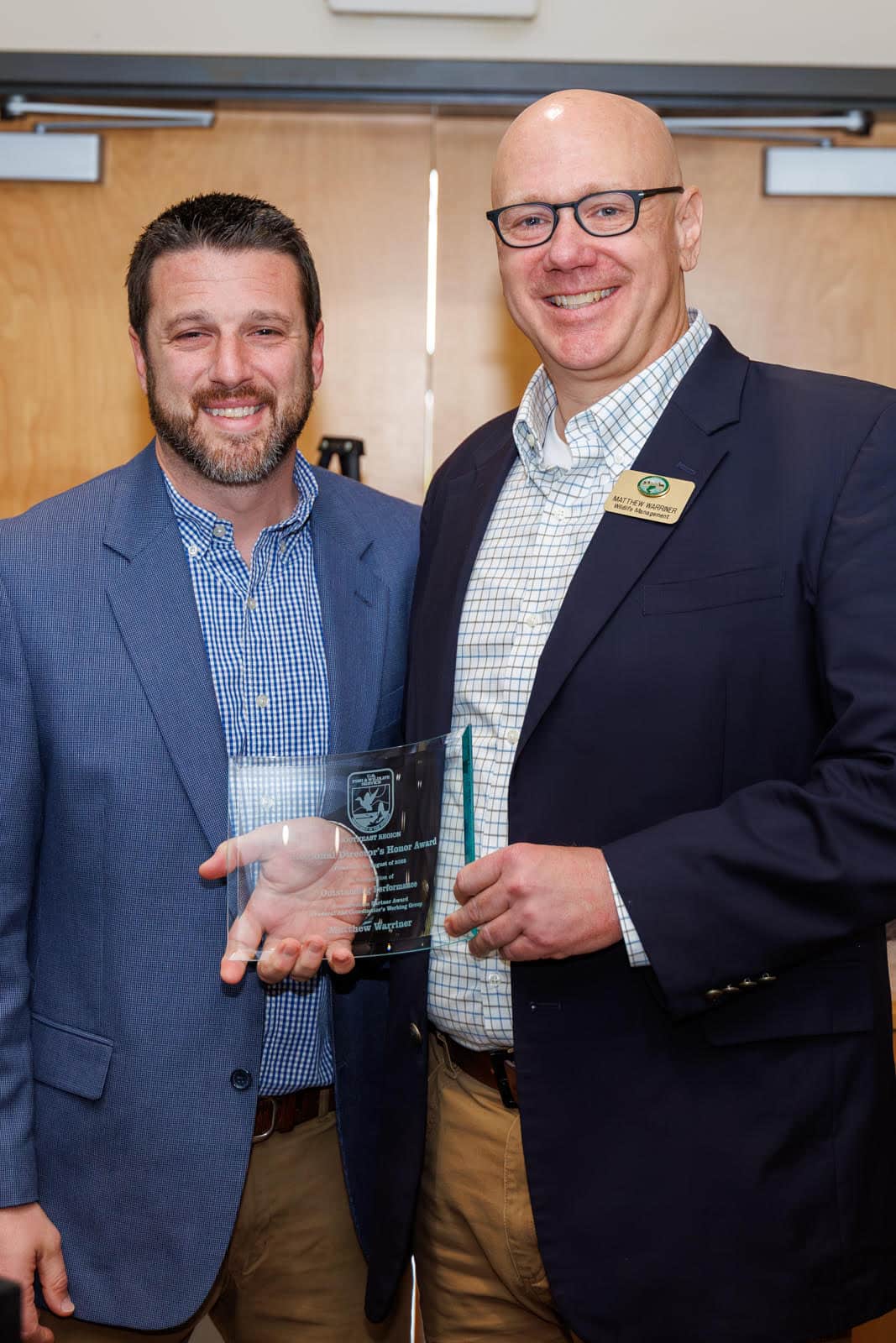 Paul Wilkes from the U.S. Fish and Wildlife Service presented Matt Warriner, assistant chief of wildlife management for the AGFC, with the Southeast Partnership Award for his work in procuring and funding public access and wildlife habitat throughout Arkansas. AGFC photo by Mike Wintroath.